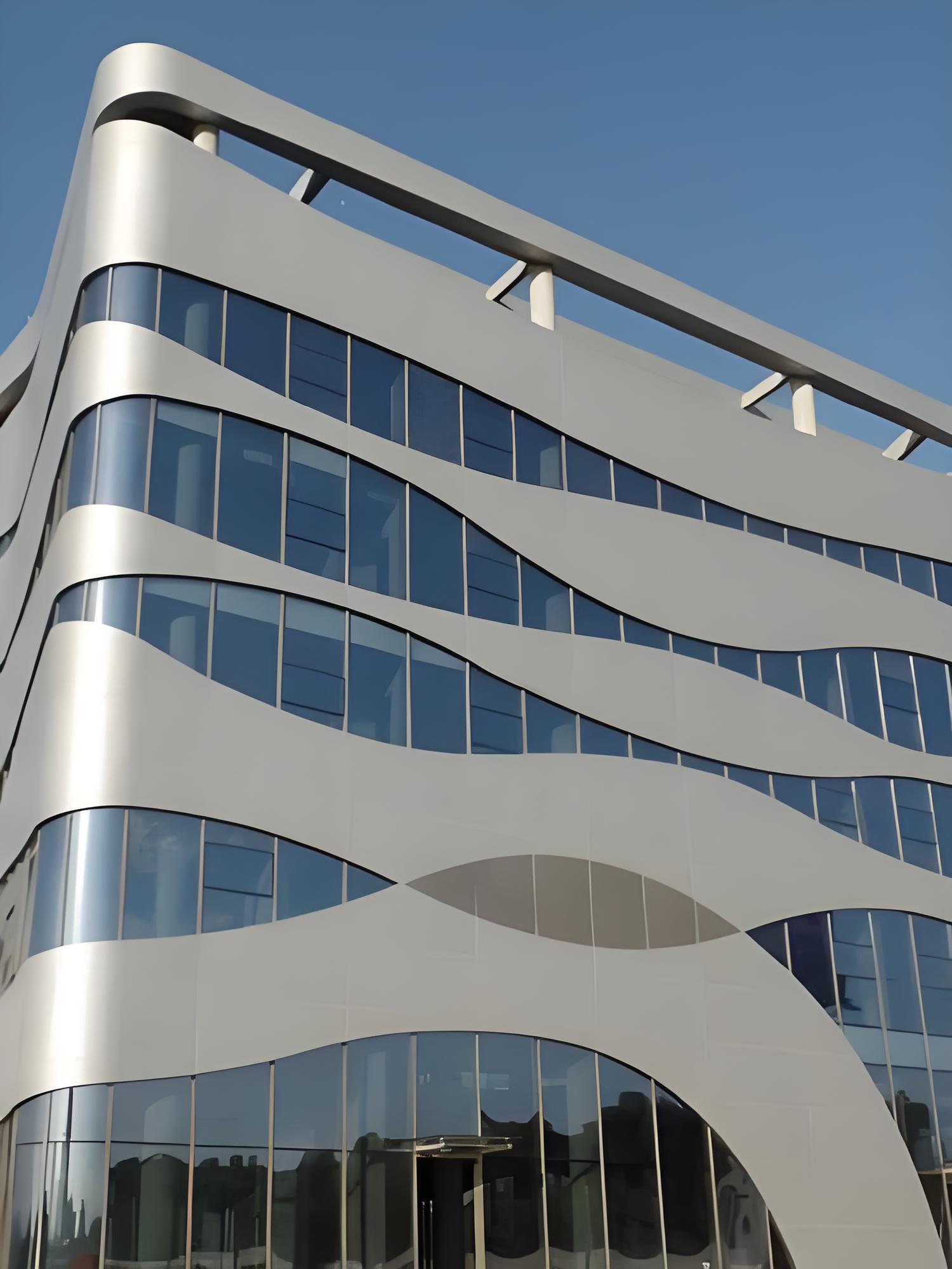 在装饰性与实用性上,氟碳铝单板表现突出。可灵活加工成平面、弧形、双曲、镂空、冲孔等多种造型,满足设计师的个性化创作需求;色彩支持哑光、金属、珠光等多种质感,可根据Pantone色卡精准定制,轻松适配不同建筑风格。同时,其表面张力低,雨水冲刷即可实现自洁,日常维护只需清水或中性清洁剂擦拭,成本低廉;防火等级达A级,燃烧无有毒气体,且铝材可100%回收,兼具环保性与安全性。
